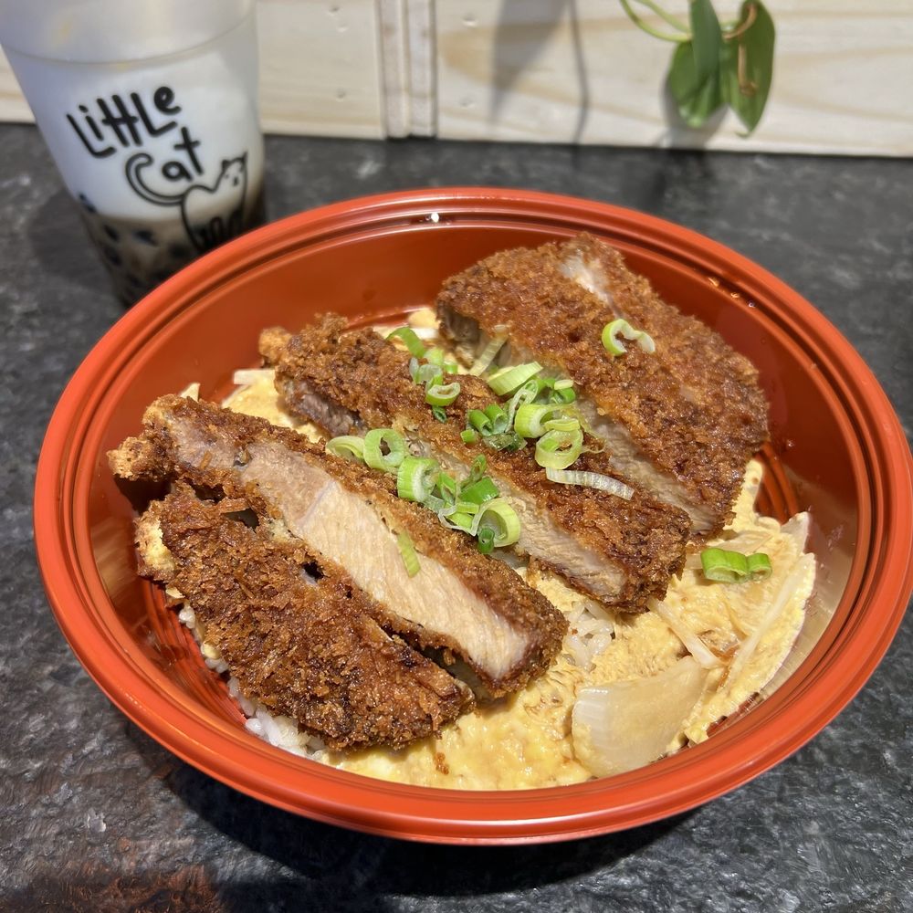 Katsu pork, onion, sauce, green onions, egg, and rice.